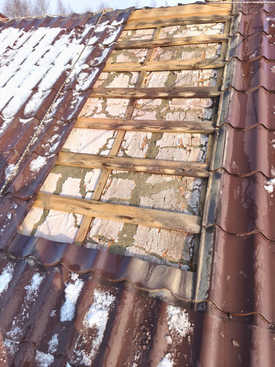 На фото — типичная картина хронического увлажнения, а не “разовая протечка”: потемнение древесины, следы длительного намокания, деградация основания и местами уже потеря ресурса обрешётки. Это выглядит как отказ влажностного режима: влага годами приходила, но не могла уйти.